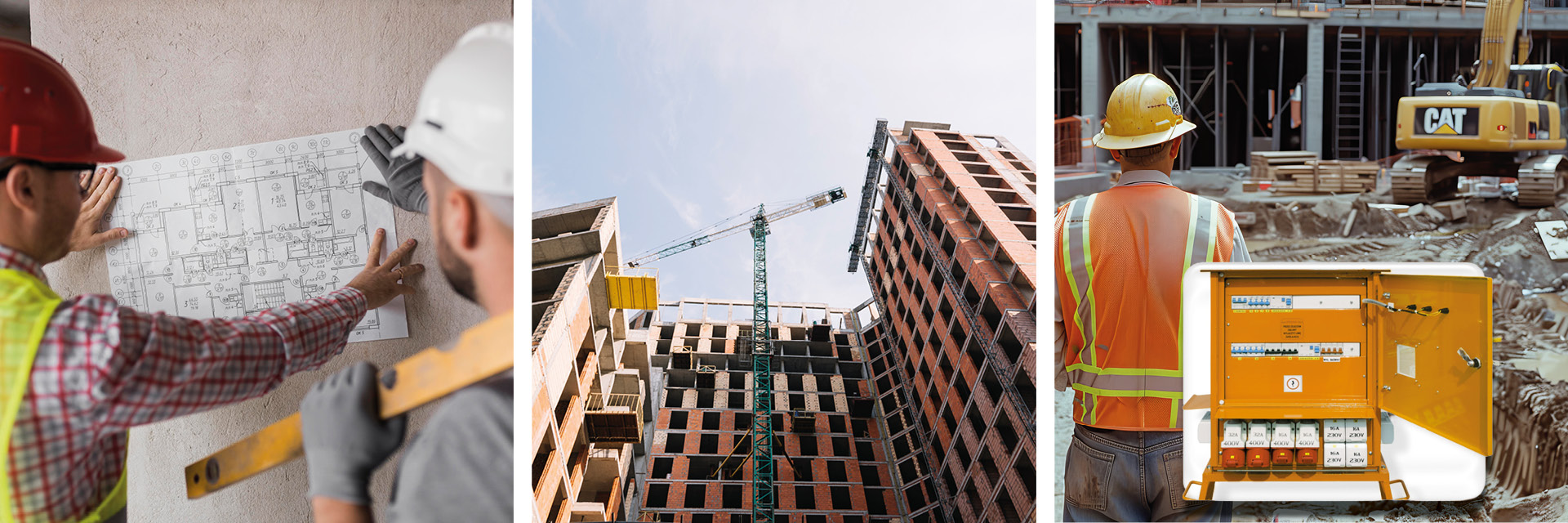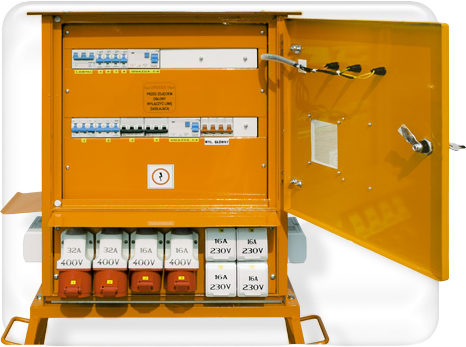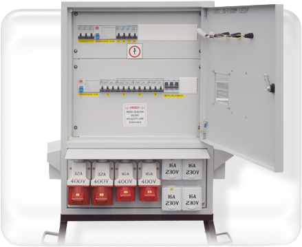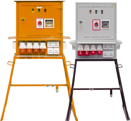 Rozdzielnia budowlana wersja metalowa na stojaku przenośnym.